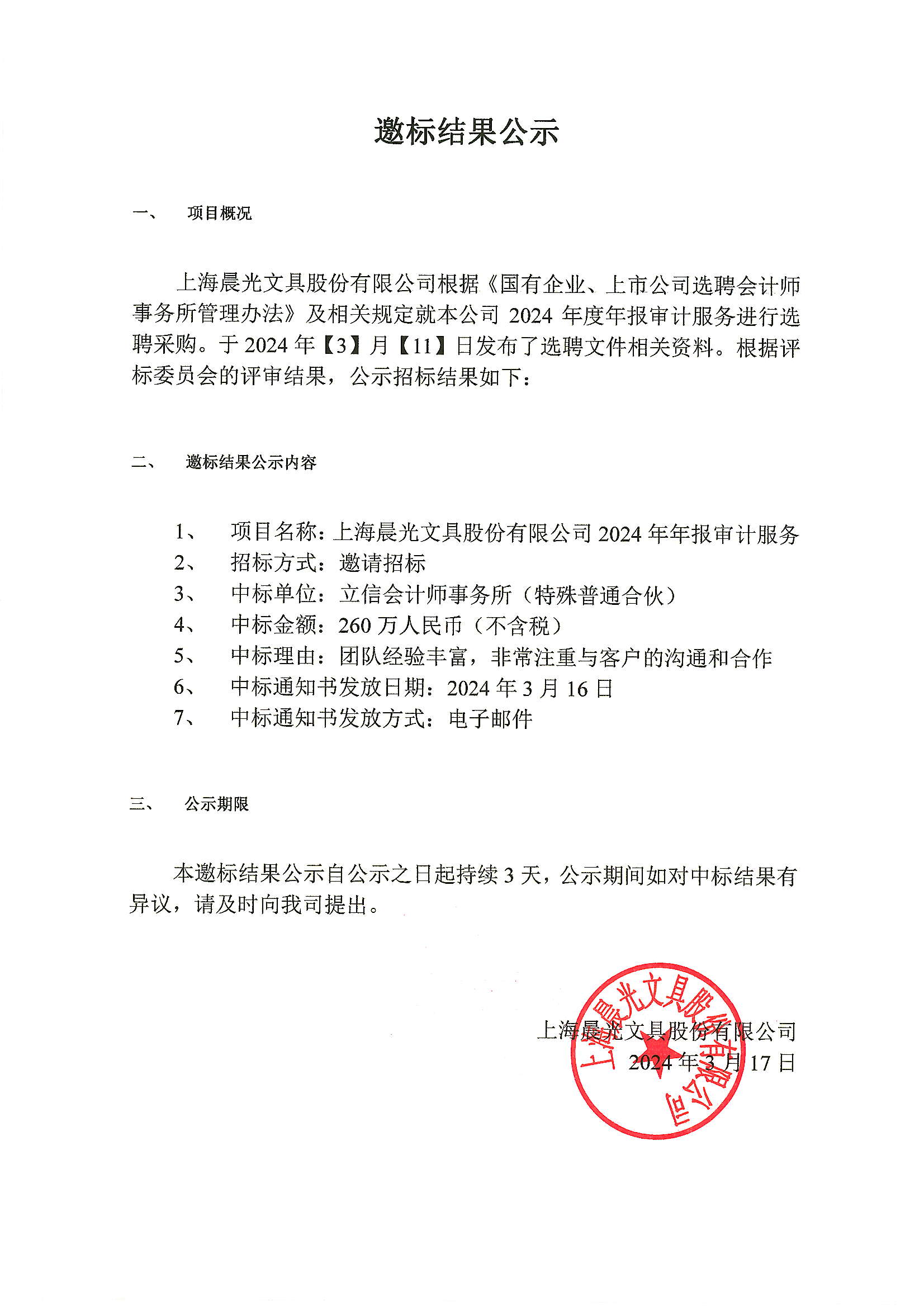 上海杏彩体育电竞 文具股份有限公司2024年年报审计服务邀标选聘文件(邀标模式)
