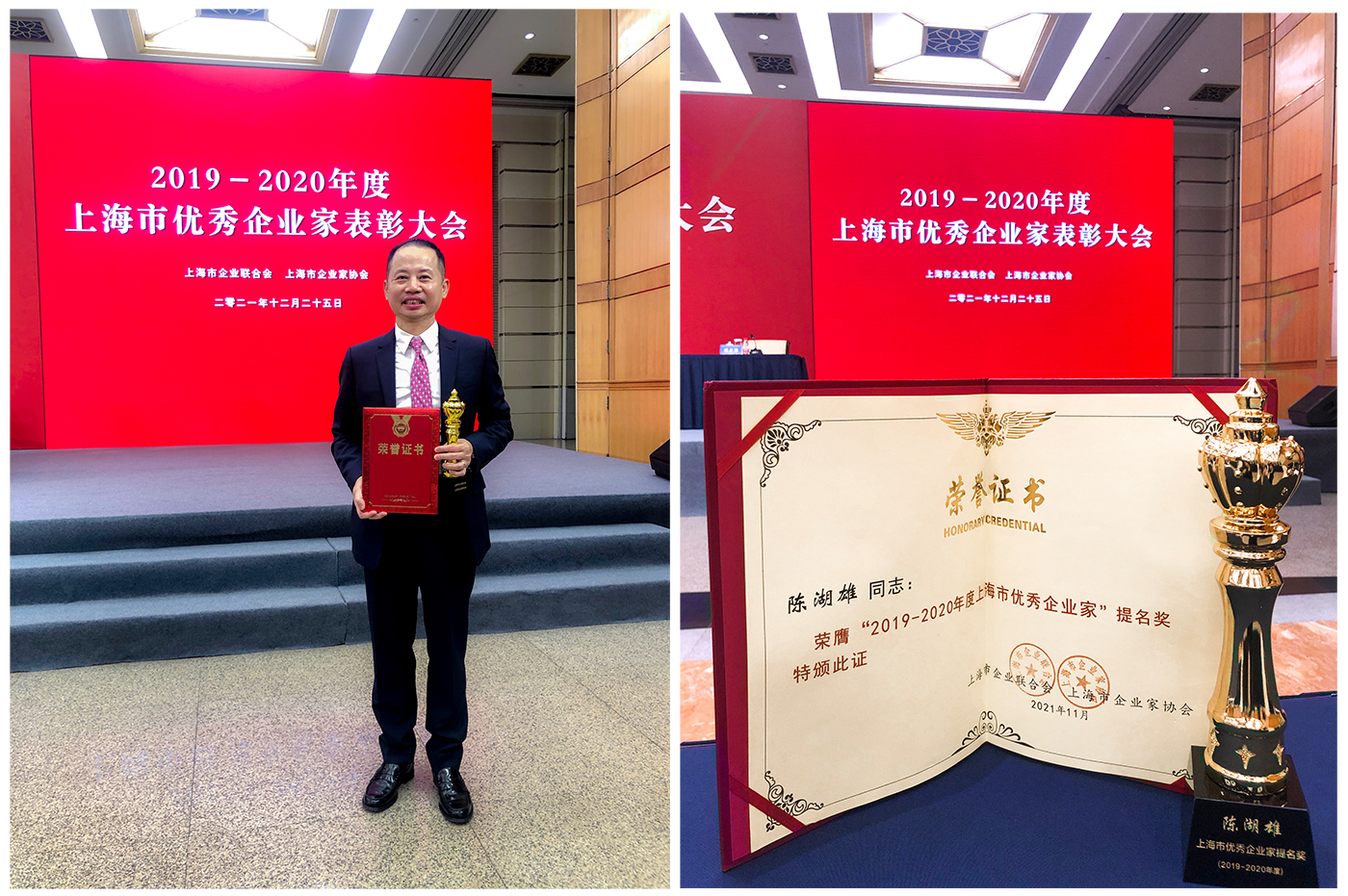 杏彩体育电竞 文具总裁陈湖雄荣获“2019-2020年度上海市优秀企业家提名奖”