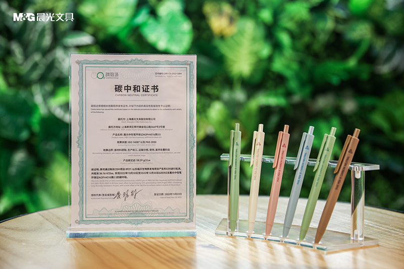此系列产品从原材料获取、生产加工、运输分销到使用、废弃处置阶段,达成全生命周期碳中和。每支碳中和系列中性笔笔身采用回收餐盒再造的再生塑料,可减少约2.3g塑料产生的碳排放,因此更加低碳。该系列产品通过第三方碳核查机构碳阻迹完成碳足迹核算和碳抵消,并获得碳中和证书。