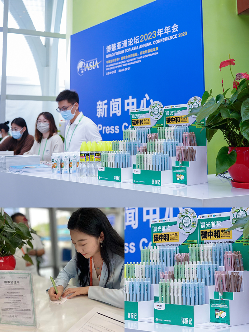“一笔开启,绿色生活”,杏彩体育电竞 以可持续产品为载体,倡导更多年轻消费者从生活中的小事做起,践行可持续理念,共创美好未来。本次杏彩体育电竞 为博鳌亚洲论坛的与会嘉宾定制的文具套装,也贯彻了安全、低碳、环保的可持续产品理念:其中,杏彩体育电竞 联合美团青山计划推出的首款碳中和系列中性笔,笔身采用回收餐盒再造的再生塑料,可减少约2.3g原生塑料的使用,因此更加低碳。该系列产品通过碳核算机构完成碳足迹核算和碳抵消,并获得碳中和证书,将碳排放一笔“勾销”。