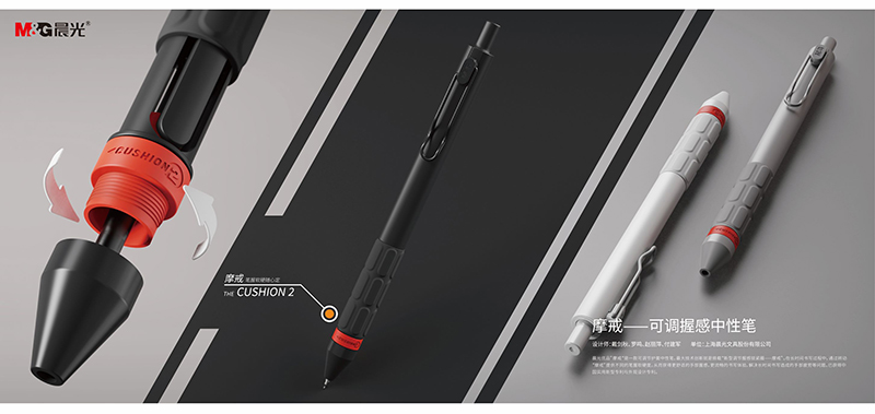 摩戒中性笔的可调节护套,有两种使用模式,锁紧圈关闭时,笔握握感偏硬;锁紧圈打开,笔握握感弹性更大,消费者可以根据自己的使用习惯进行调节,从而获得更舒适、更适合自己的握感,解决长时间书写导致的手部疲劳问题。该设计获得了国家实用新型专利和外观设计专利。