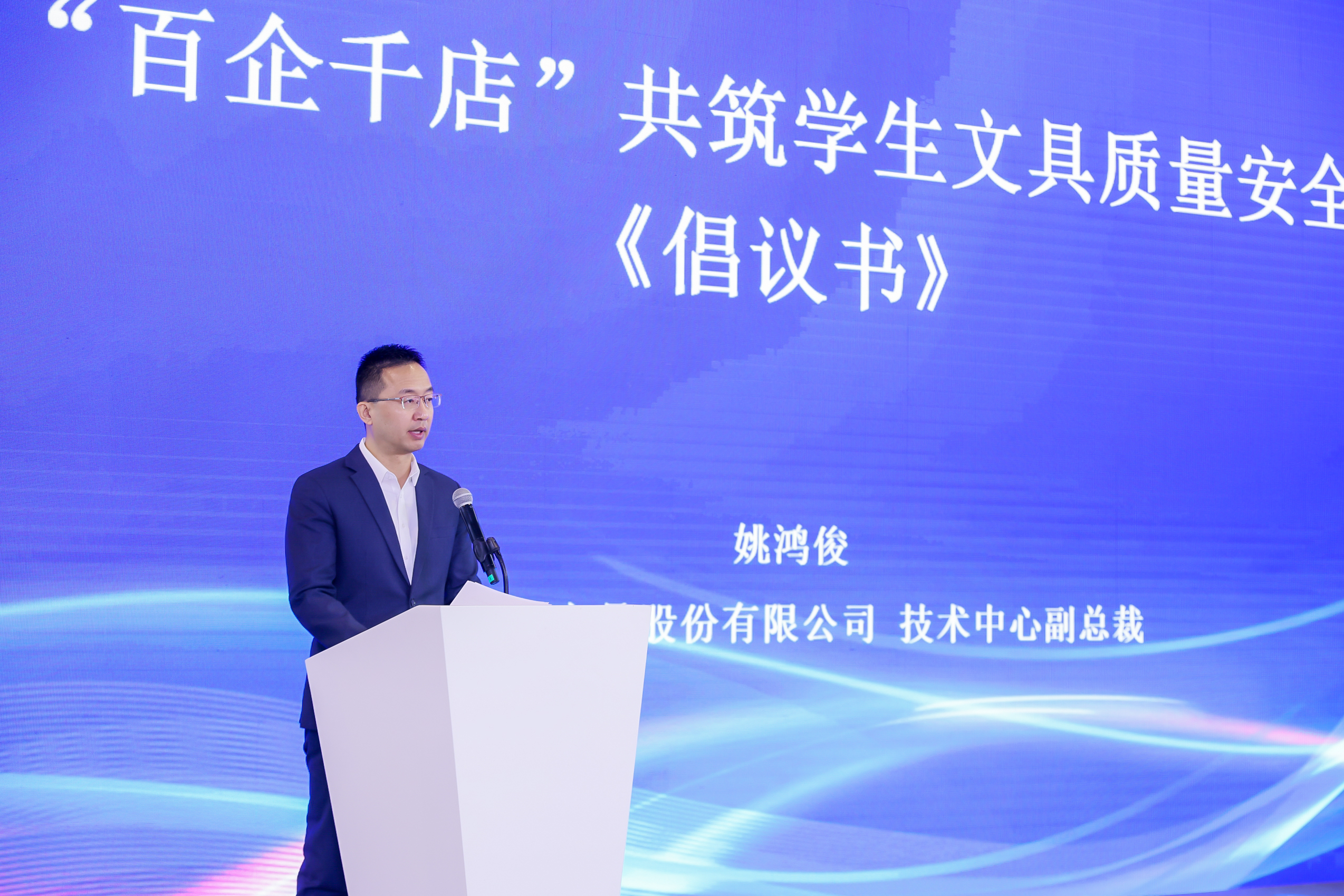 上海杏彩体育电竞 文具股份有限公司副总裁姚鸿俊作为专委会企业代表上台宣读《‘百企千店’共筑学生文具质量安全活动倡议书》。