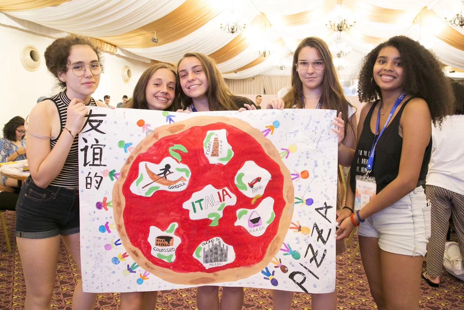 几位少女,虽然来自不同的国家,却共同用画笔,绘制友谊的大披萨,愿友情长存。