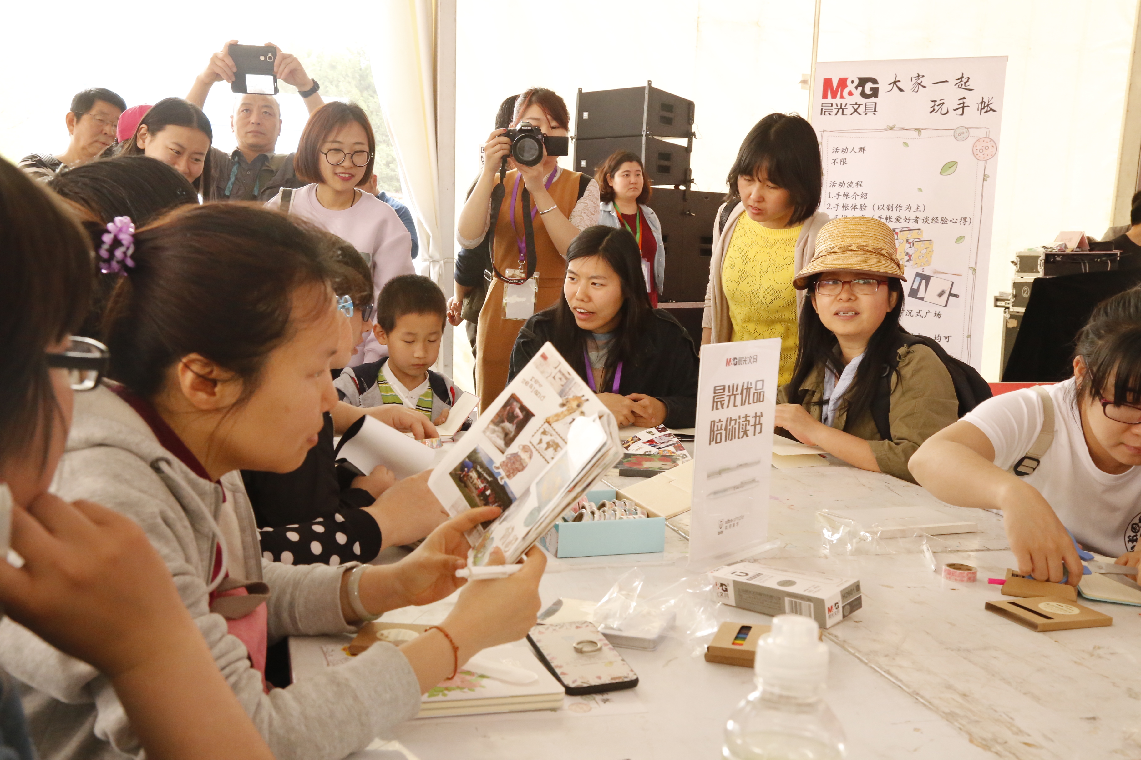 文具在本届书市中特别推出“大家一起玩手账”活动,特邀北京手账集市的手账达人现场进行手账的分享和指导,大家一起动手进行手账大作战。现场活动的热烈气氛也吸引了北京电视台的关注,并把此次活动作为书市百余项互动体验活动的代表同时在北京卫视、北京新闻台于当天进行了现场实时报道。