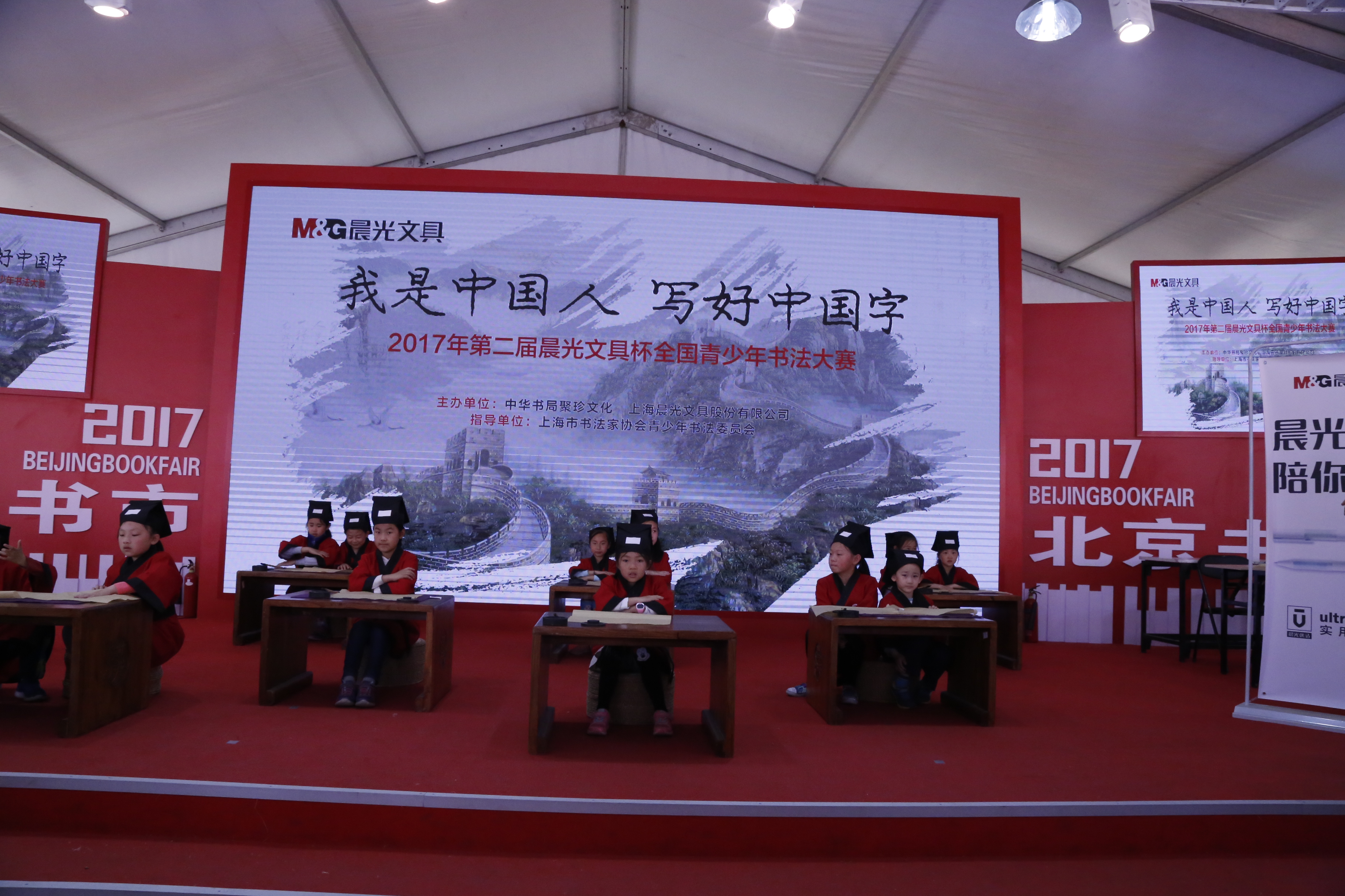 文具杯第二届全国青少年书法大赛也在在北京书市现场启动,近20位身着汉服的小朋友现场为大家表演了中国传统文化的抚心、开笔礼等仪式,专业书法机构的老师现场指导小朋友进行毛笔的书写。