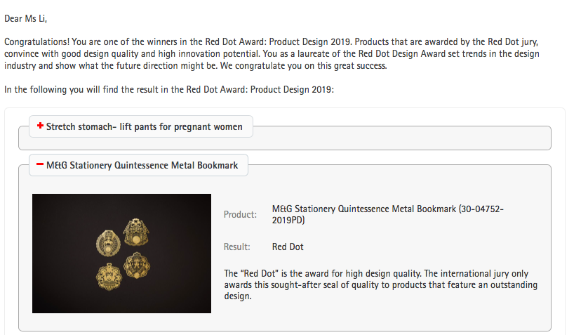 发布信息年月日:2019-04-08近来,2019年德国红点奖获奖名单正式出炉。杏彩体育电竞 学习用品鼎盛新颜一系列-国粹金属书签光凭观念与过去的相融合的独特美、设计构思构思的设计构思、精细化的作工从众心理多团体赛影视作品中出类拔萃,作为2019年红点产品设计奖的佼佼者。这也是继杏彩体育电竞 首次斩获2019德国iF奖后的又一世界级设计大奖!