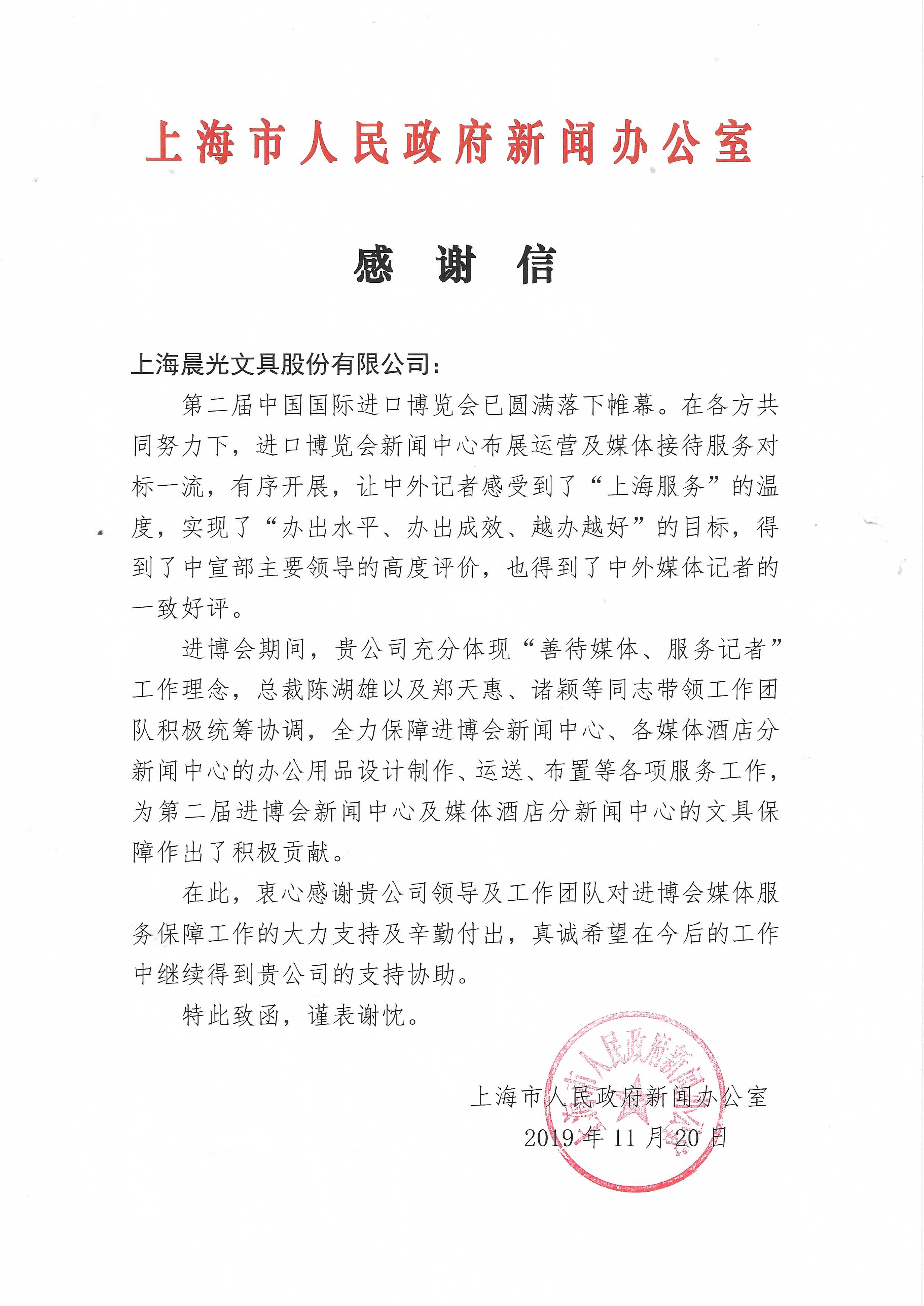 一封感谢信!上海市新闻办与进博杏彩体育共同点赞杏彩体育电竞