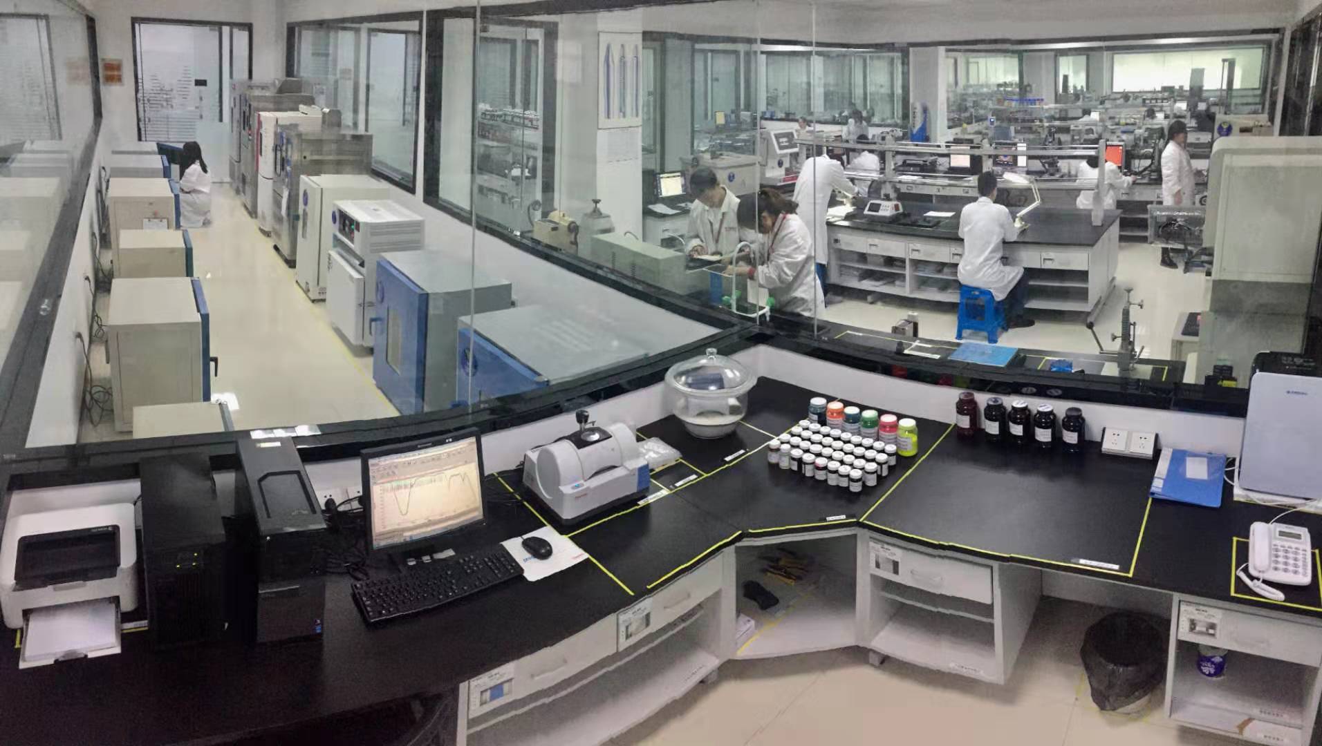 办公文具检侧检测室占地赔偿1200m²,布局了理化实验室、光学与力学实验室、新材料实验室、环境模拟实验室、电子实验室等14间主要功能实验室,拥有专业的技术人员30名,各类专业的检测仪器设备138台。